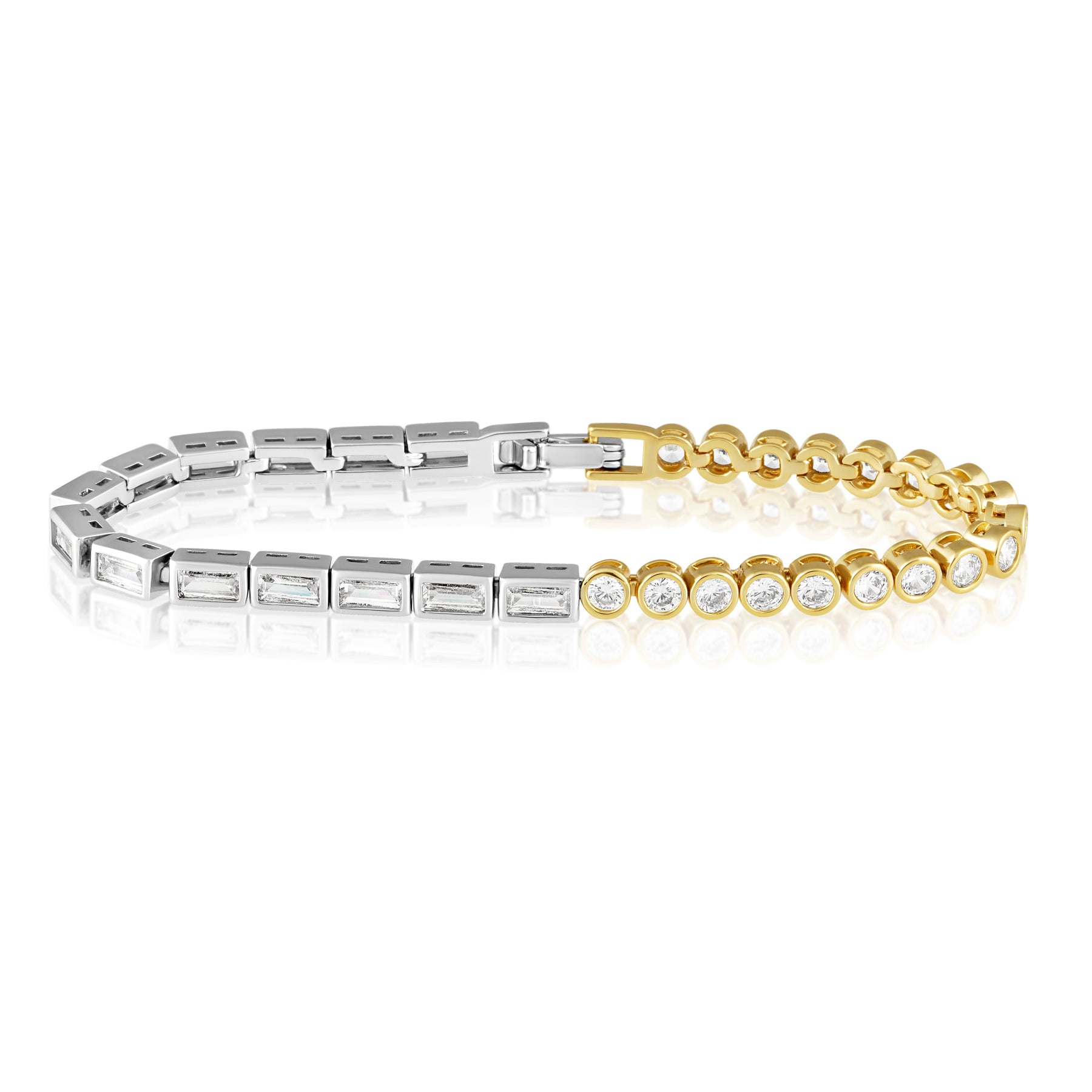 Experience the thrill of the unknown with our Spencer Two-Tone Bezel Tennis Bracelet. With a daring combination of half silver emerald cut and half gold round cut, this bracelet will add an edge to any outfit. Dare to be different and stand out from the crowd with this unique piece.