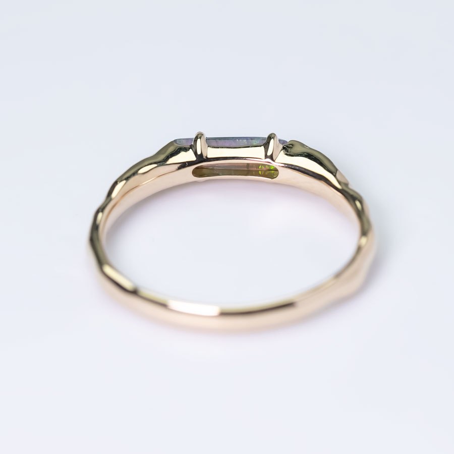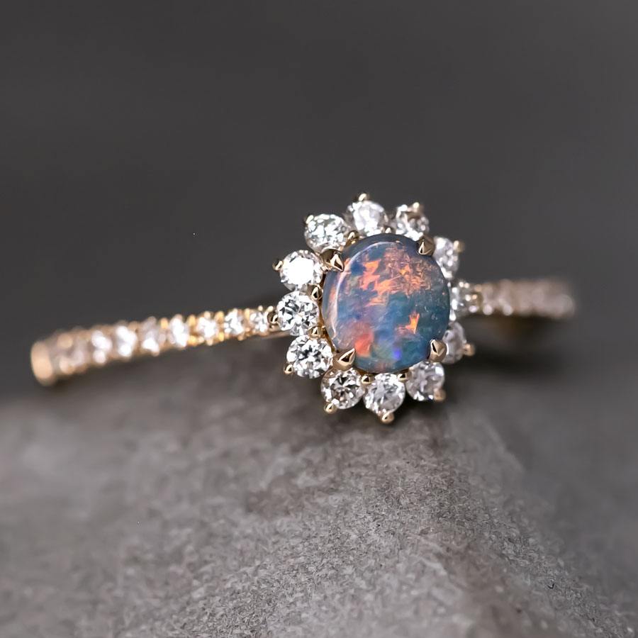 Design Idea: I discovered this stunning red Lightning Ridge black opal years ago, and now I've crafted it into this exquisite design. The hammered finish on the ring band adds a unique texture.