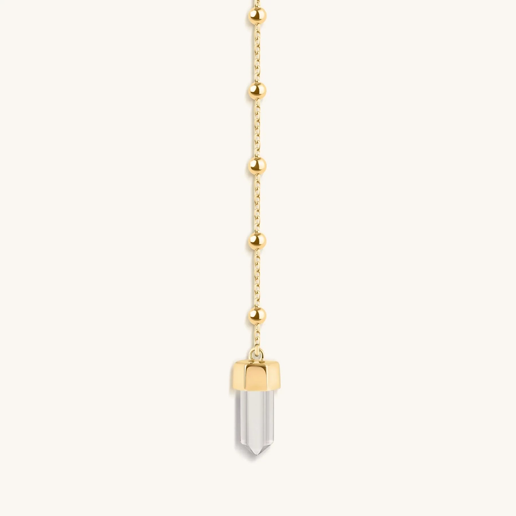 By energetically tuning into your 7 Chakras, this 7 Chakra stone necklace will help you attract positivity and open up the flow of energy in your body. Wearing the “Crown of Abundance Clear Quartz and 7 Chakra Stones Necklace” is an excellent reminder to continue to evolve into your highest level of consciousness. With 4mm beads of Amethyst, Garnet, Peridot, Blue Topaz, Lolite, Citrine, and Carnelian shimmering across the top of a Clear Quartz pointer all on an 18K Gold-Plated Brass ball chain, this stunning necklace will add a glamorous pop of color to your outfit.